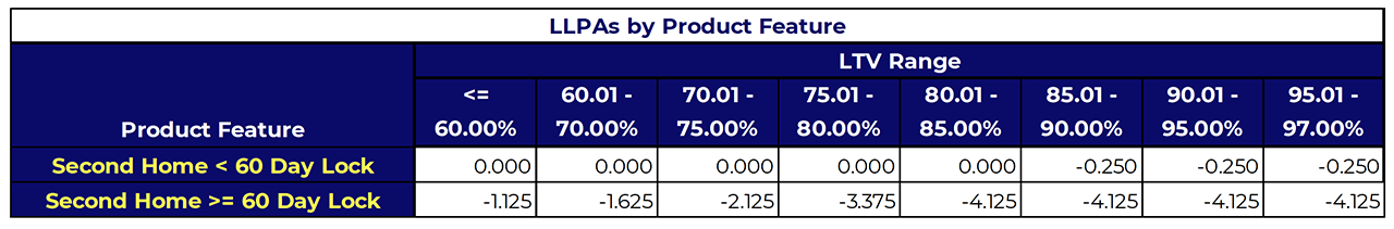 - Introduce new Second Home >= 60 Day Lock Period LLPA
