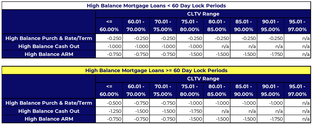 - Introduce new ‘High Balance Mortgage Loans >=60 Day Lock Period’ Grid